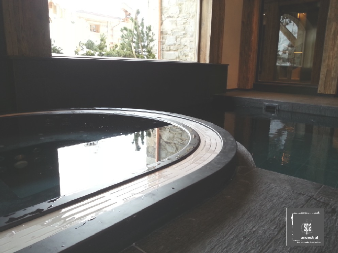Spa aux lignes exclusives réalisé sur mesure avec une finition sombre. La texture et la matière permettent une intégration réussie à coté d'une piscine intérieure au parement de type ardoise.